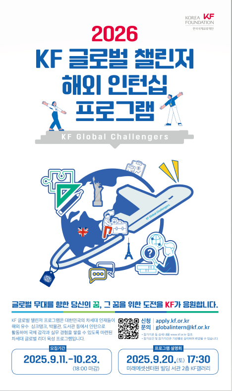 KF 글로벌 챌린저는 대한민국의 차세대 인재들이 해외 유수 싱크탱크, 박물관, 도서관, 국제기구/국제NGO 등의 기관에서 인턴으로 활동하며 국제 감각과 실무 경험을 쌓을 수 있도록 마련된 차세대 글로벌리더 육성 프로그램입니다. 관심있는 우리 청년들의 많은 지원 바랍니다.